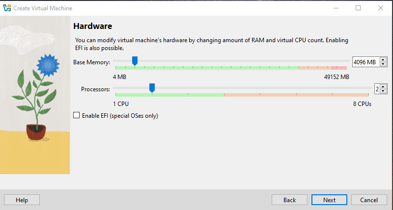 Tentukan alokasi RAM untuk mesin virtual. Disarankan untuk tidak melebihi setengah dari total RAM di komputer Anda. Misalnya, jika komputer Anda memiliki 8GB RAM, Anda bisa memberikan 2GB–4GB. disini saya contohkan 4096 MB atau sama dengan 4GB dan Processor 2