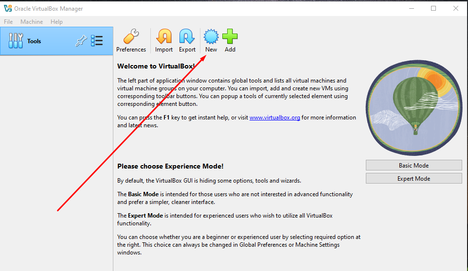 Untuk membuat mesin virtual baru, klik tombol New, atau buka menu Machine > New, atau tekan kombinasi tombol Ctrl + N.