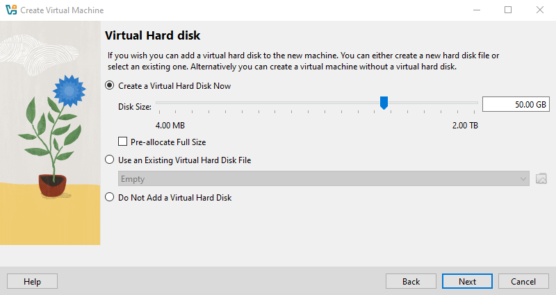 Tentukan lokasi penyimpanan file dan kapasitas hard disk virtual. Misalnya, Anda bisa menentukan kapasitas sebesar 50GB.