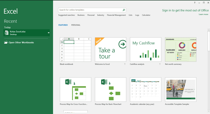 Semenjak versi excel 2013, microsoft mulai memperkenalkan startscreen atau tampilan awal seperti dibawah ini saat anda pertama kali membuka aplikasi microsoft office excel.